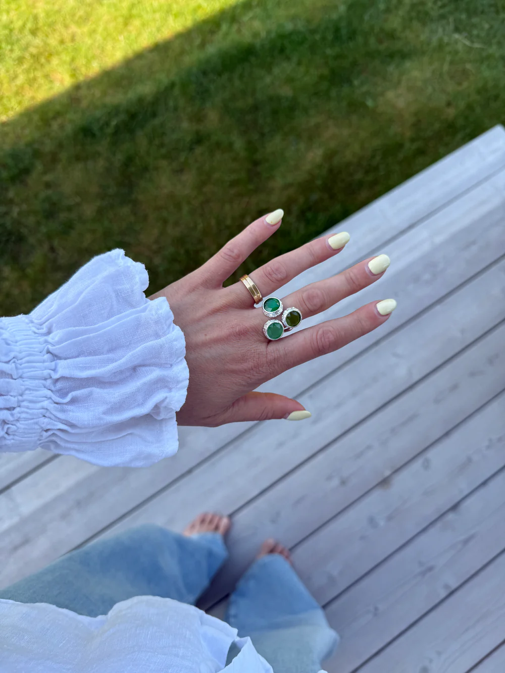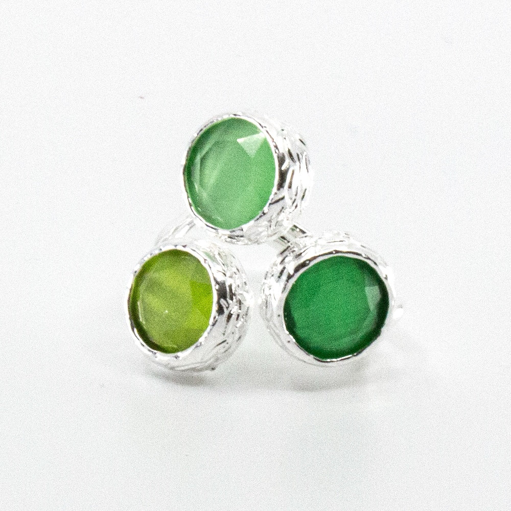 En riktig utstickare - denna maffiga ring, ett gediget hantverk. 3 stenar i jade/gröna nyanser, infattade i silverplätering.