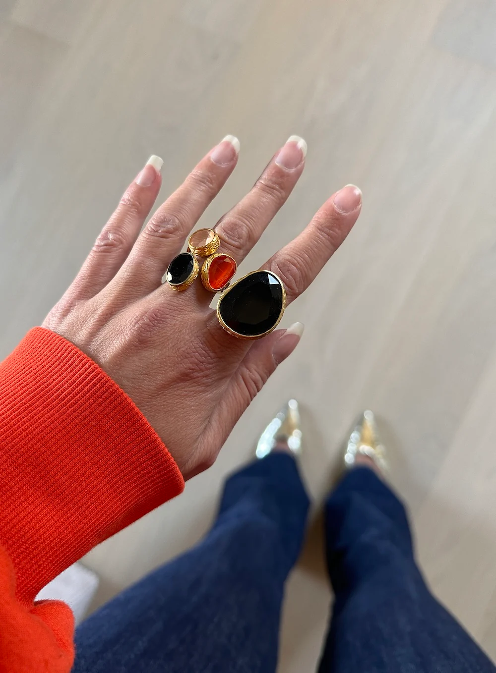 En riktig utstickare - denna maffiga ring, ett gediget hantverk. 3 stenar i harmonierande nyanser, infattade i guldplätering.