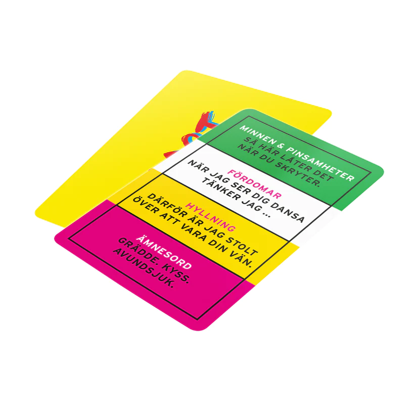 På varje spelkort finns 4 kategorier som hjälper er att roasta varandra: Minnen & pinsamheter/Fördomar/Hyllningar/Ämnesord