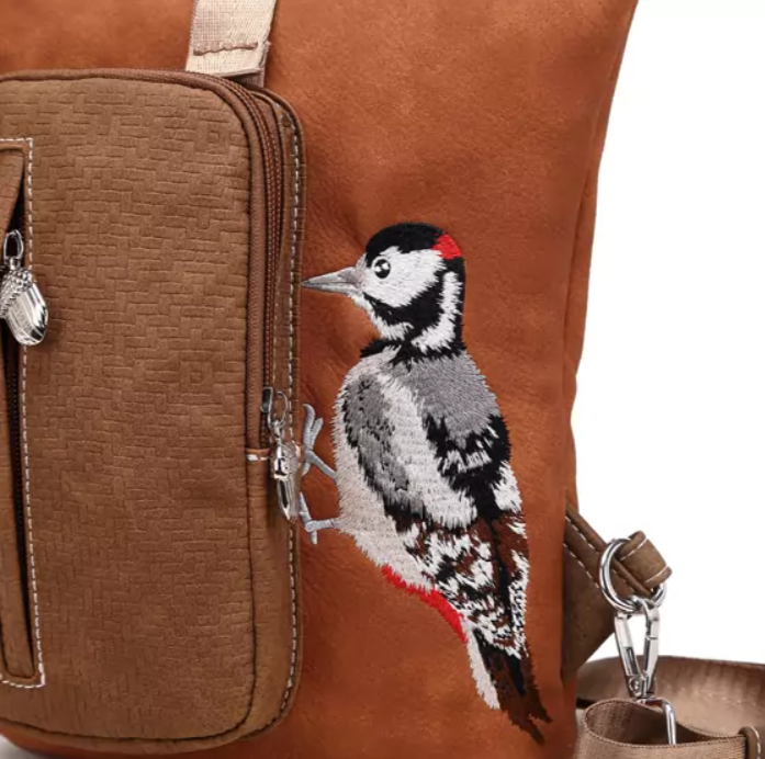 Ryggsäck sling back i veganskt läder med en broderad hackspett. Flera fack. Många festliga detaljer, såsom mönstrade fodret, ekollonet man drar i för att dra upp dragkedjan.