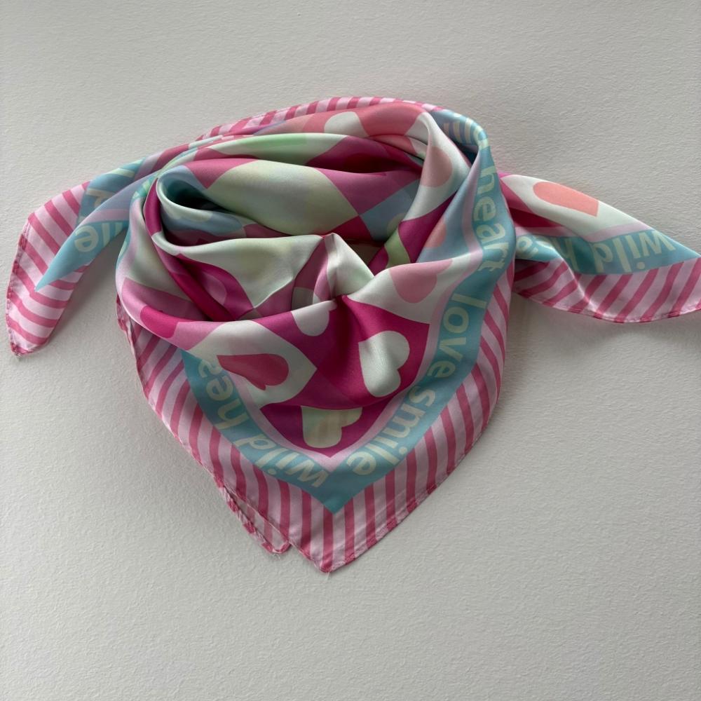 Festlig scarves i silkigt material. I rosa, cerise, blå, vit, grön mm. Text runtom: Wild, heart, love, smile samt en randig kant i rosa och cerise.