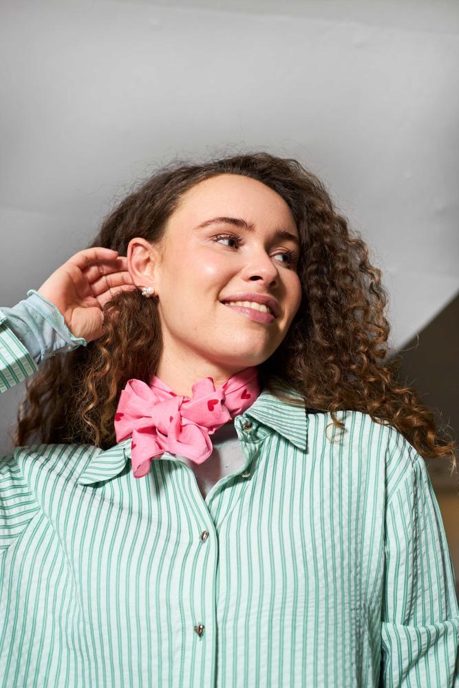 En härligt sprakande färgkombo; rosa scarves med små röda hjärtan.