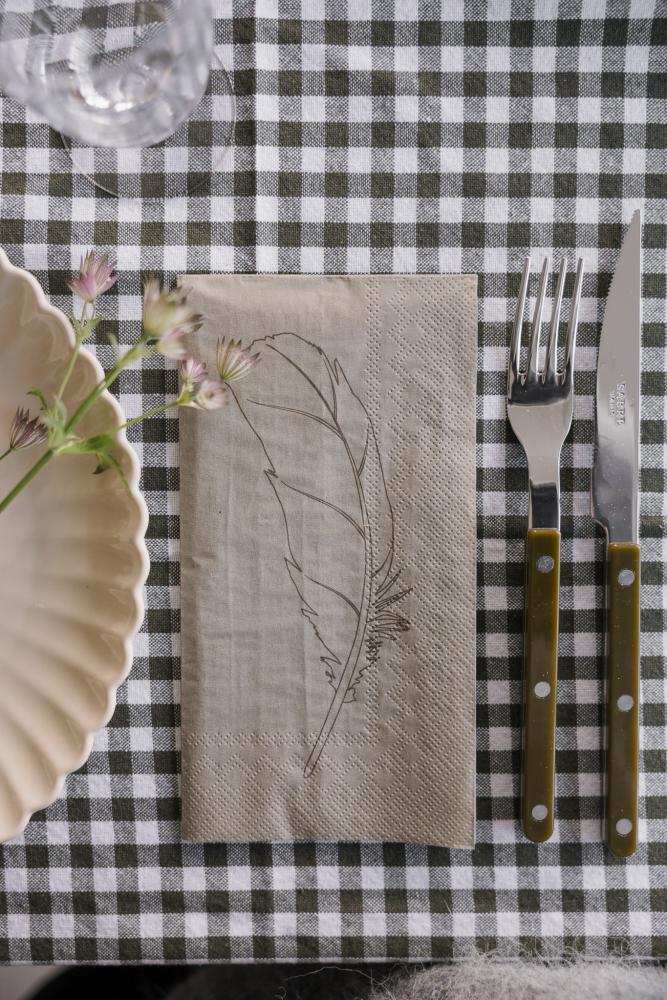 Servett med en fjäder, gör sig fin till det dukade påskbordet i naturliga jordfärger.