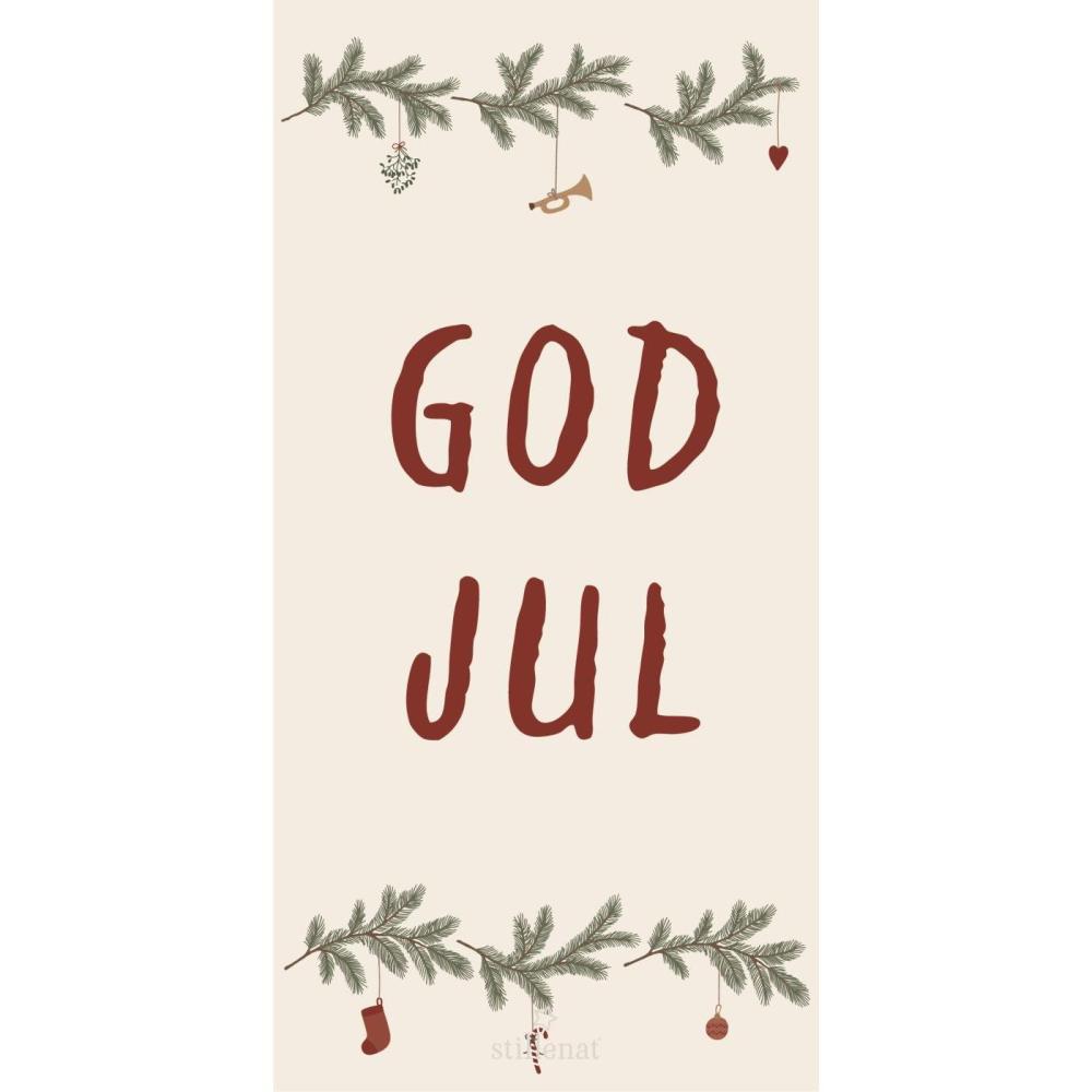 Trevliga servetter i ett avlångt format, med julpynt som hänger i en grön girlang / grankvist. Röd text: GOD JUL