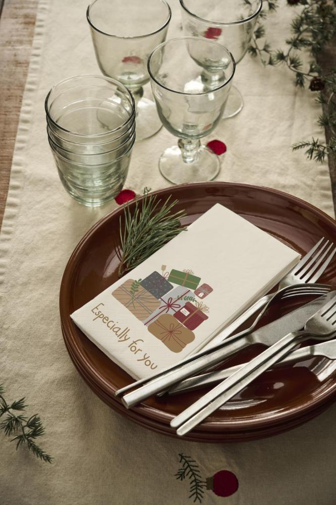 Trevliga servetter i ett avlångt format, med julklappar och texten: Especially for you