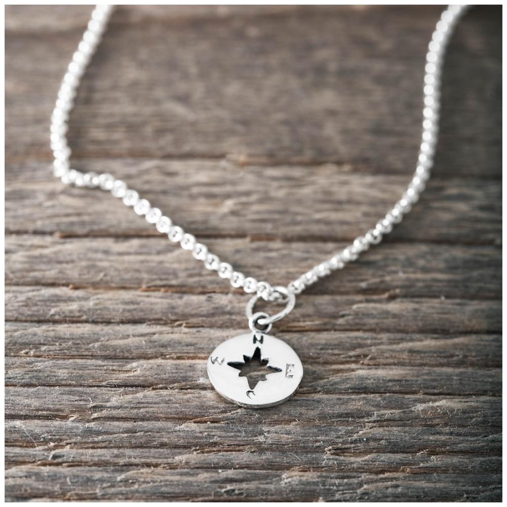 Vackert halsband med en tunn kedja och kompass i äkta silver som har de olika väderstrecken stansade på sig