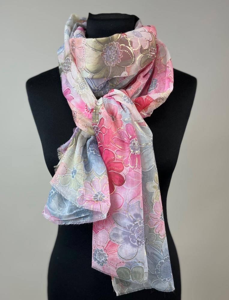 Mönstrad scarves med blommor i sköna färger, såsom grönt, blått, rosa, cerise samt guldfärgade detaljer.