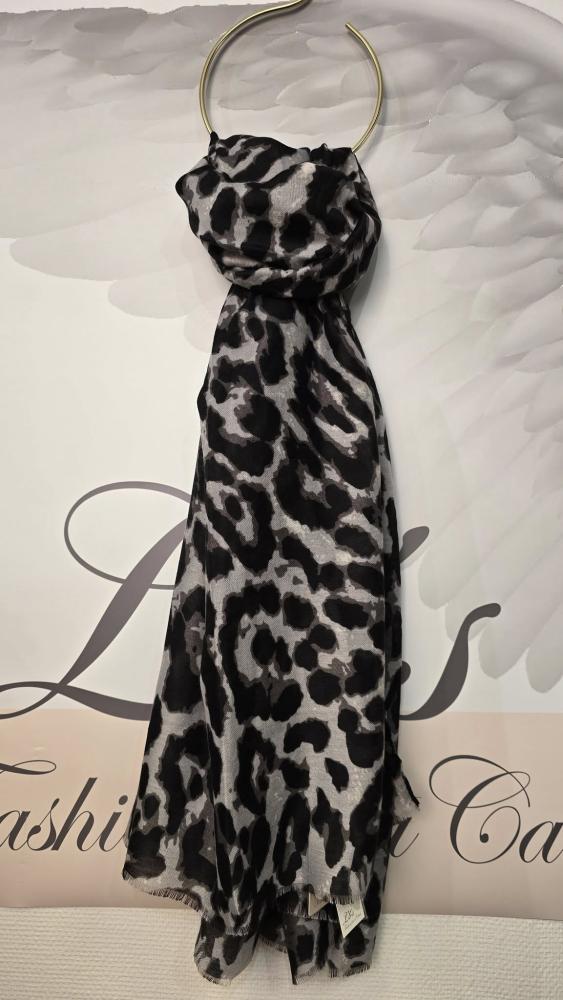 Trendig leomönstrad mjuk sjal. Grå botten med svart print.
