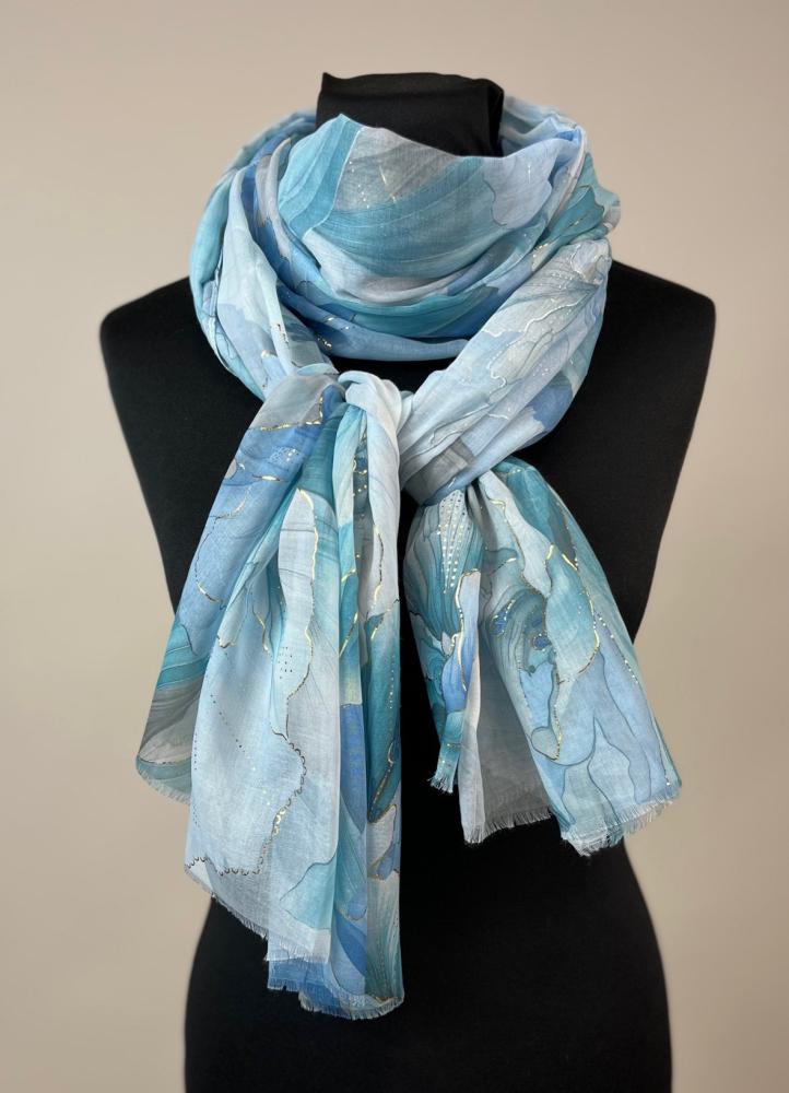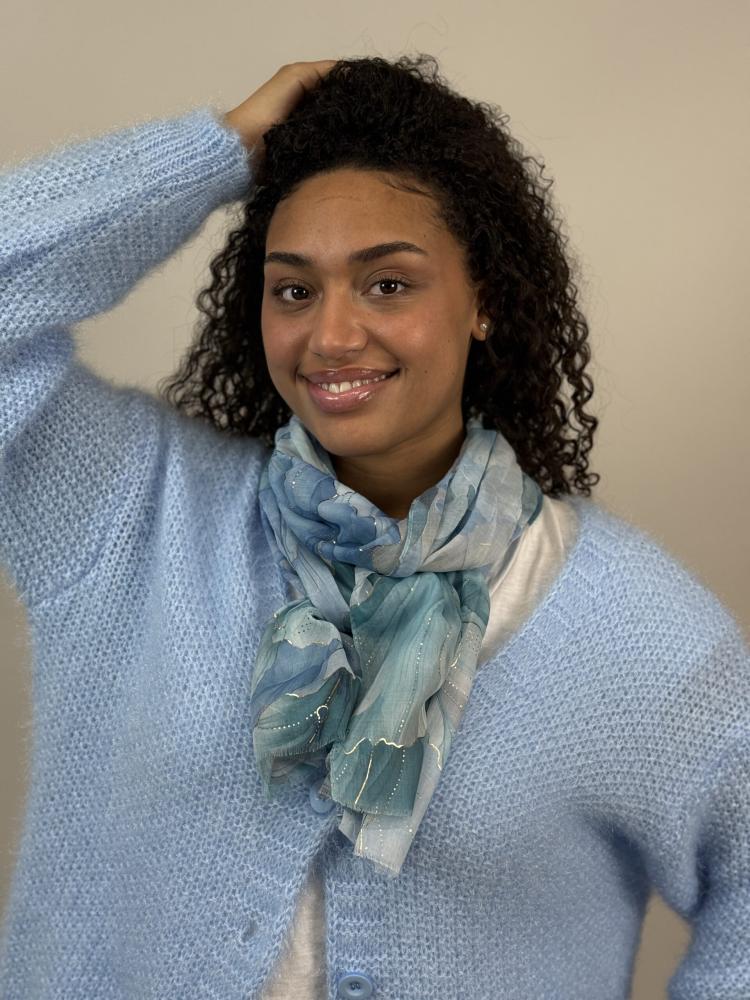Mönstrad scarves i mjuka blå toner samt diskreta guldfärgade inslag.