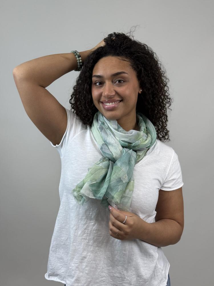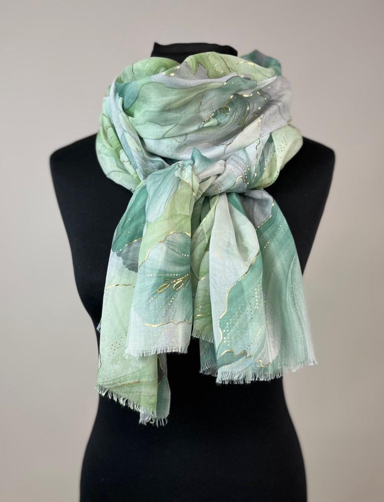 Mönstrad scarves i mjuka gröna toner samt diskreta guldfärgade inslag.