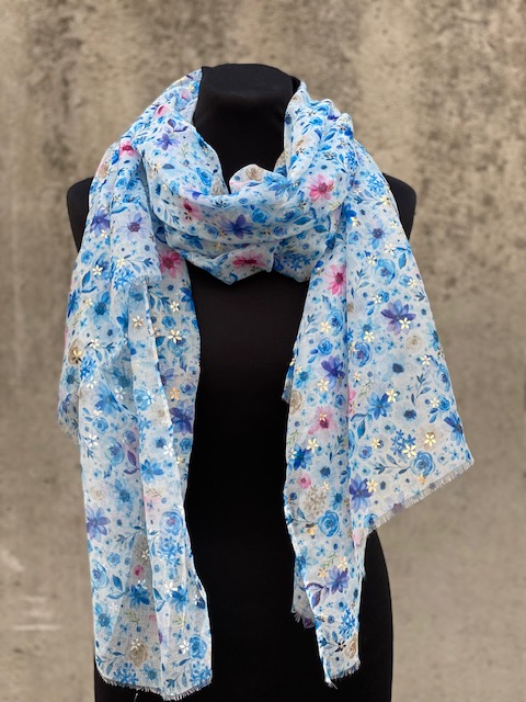 Mönstrad scarves, vit botten med blommor i olika blå och rosa nyanser - samt guldfärgade inslag.