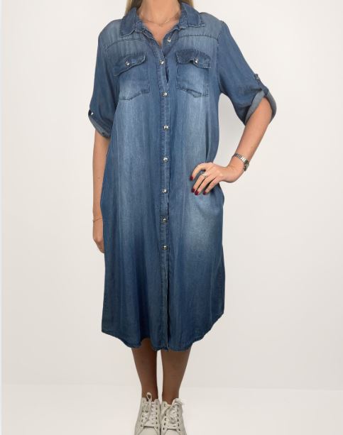 Helknäppt klänning med krage och bröstfickor med lock. Slejf på ärmen, vilket gör att du kan reglera längden. Lika snygg med ett par sandaler eller sneakers, som med ett par grövre boots och en mockajacka. Härligt material.