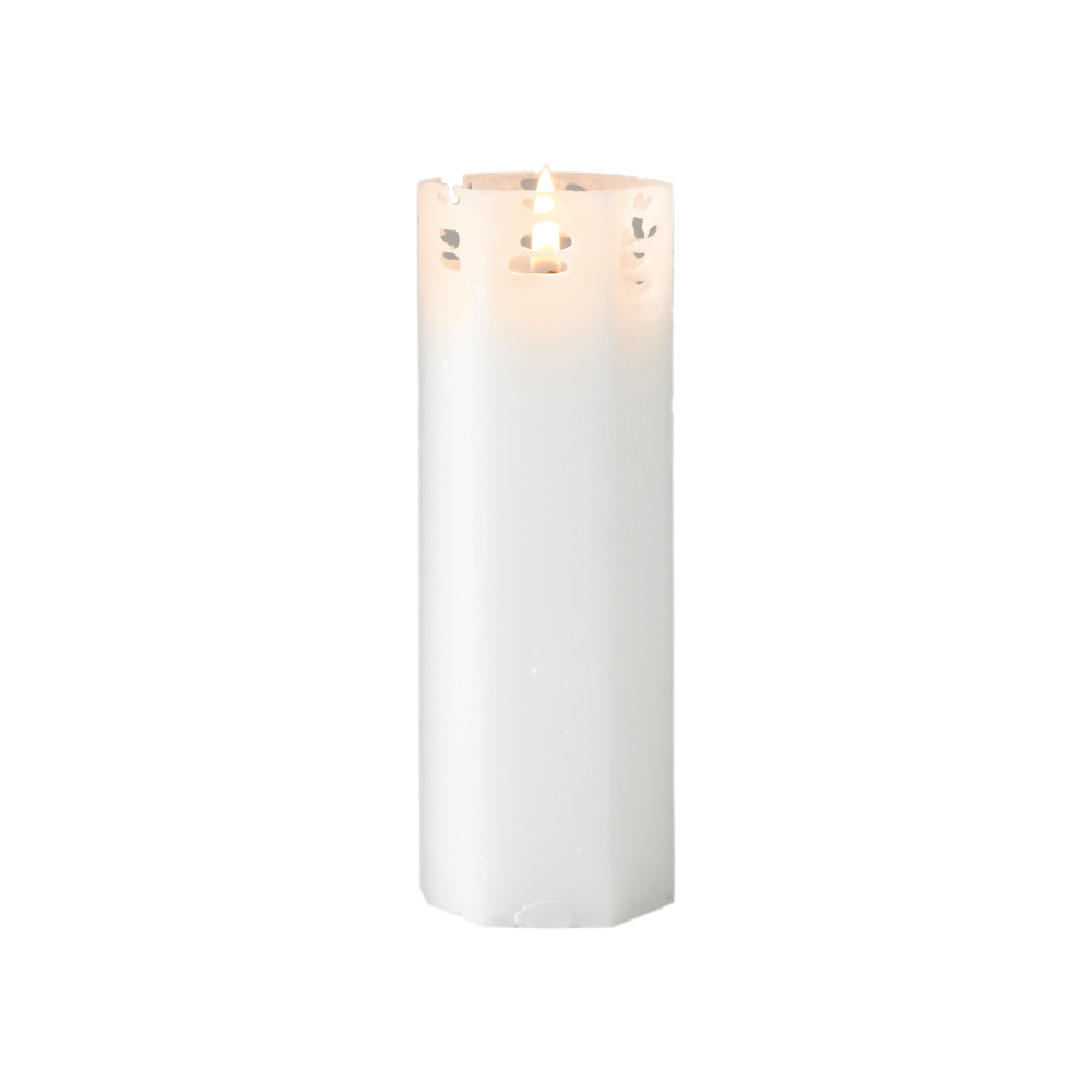 Denna unika ljusupplevelse ger dig inte bara en behaglig belysning utan också en fascinerande visuell effekt när ljuset dansar över det pärlemorskimrande vita ytan. Dess brinntid på 25 timmar ger dig många stunder av lugn och ro att njuta av dess skönhet.