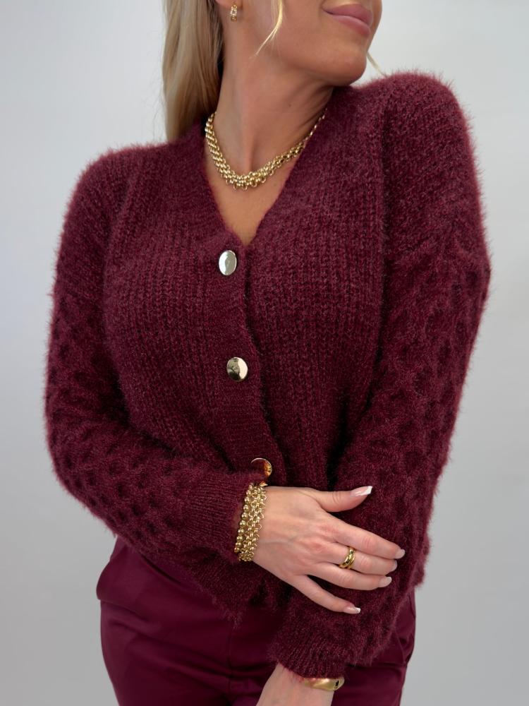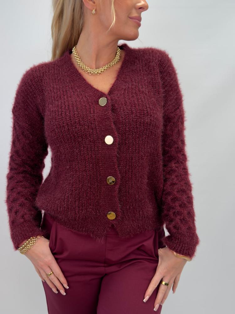 Stickad kofta med guldknappar, Vinröd Siv - Gemini