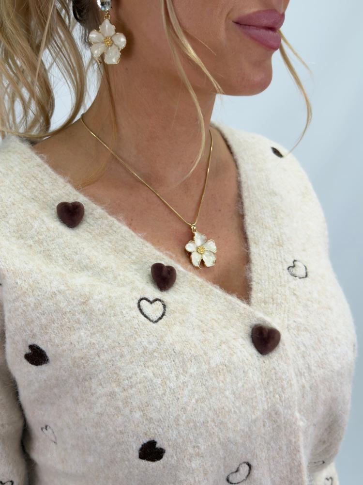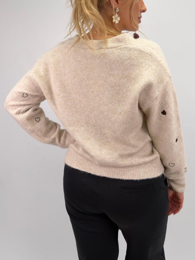 Fin stickad v-ringad kofta i en mjuk beige ton. Prydd med både fyllda och ofyllda hjärtan - samt knappar i brun sammet formade som hjärtan.