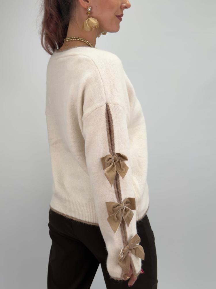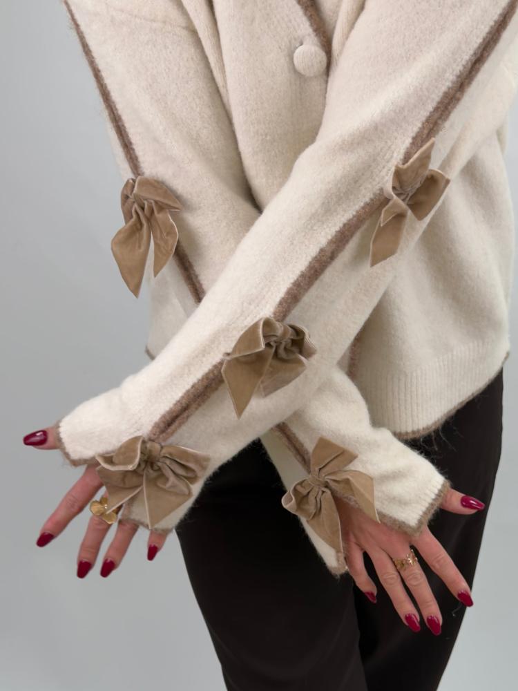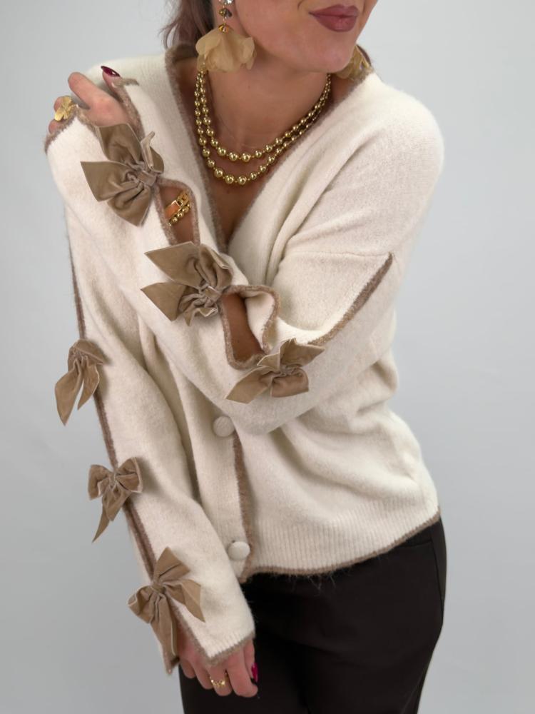 En vit mjuk kofta, med påsydda taupefärgade rosetter längs ärmarna - Onesize (stl 34-44)