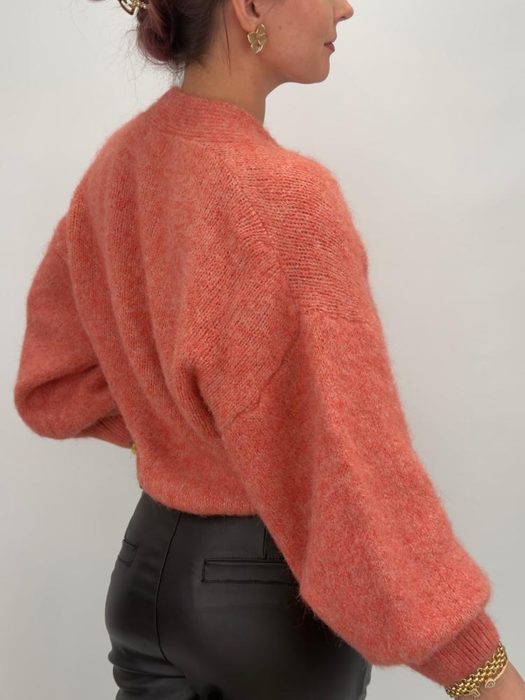 Kofta med knyt och djup v-ringning i en ljuvlig korallfärgad ton. Generös passform och puffiga ärmar ger ett både avslappnat som elegant uttryck. Fin att bära med en topp under - eller som den är.