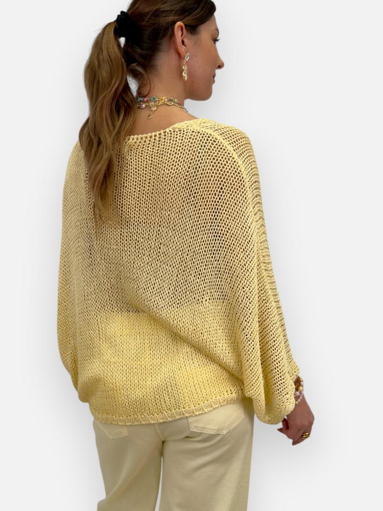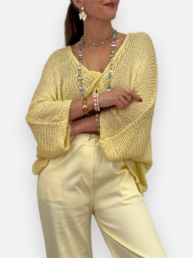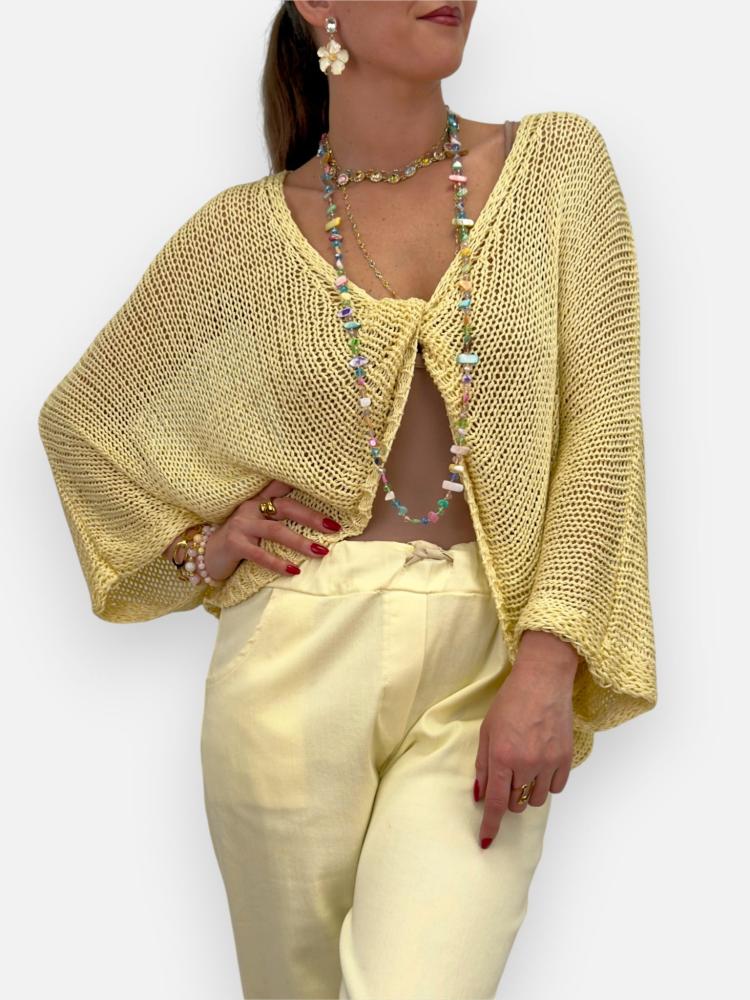 Fin glest stickad tröja i trendigt gult. Den luftiga stickningen ger en sval och avslappnad känsla, och knuten fram blir en lite lekfull detalj. Släng den över en topp/klänning - och låt den falla fritt.
