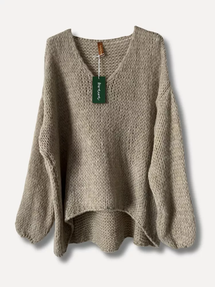 Mjuk, härlig och rymlig oversize tröja med v-hals i en trendig brun nyans. Kortare fram än bak.
