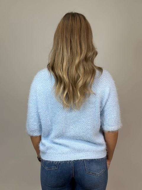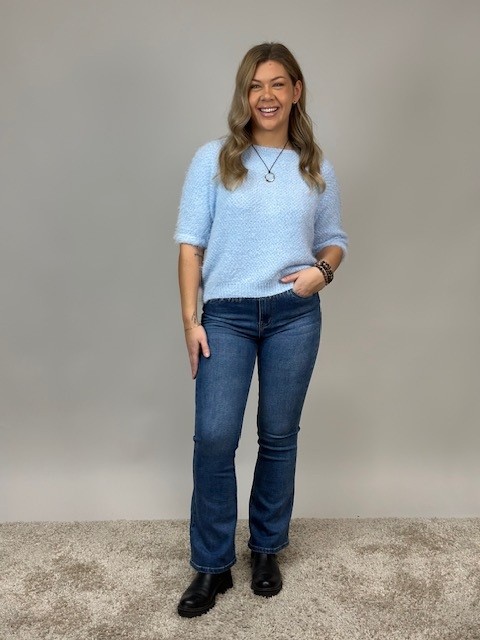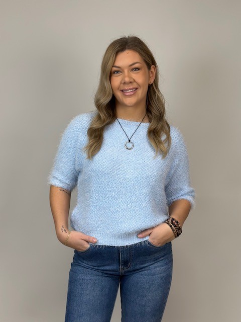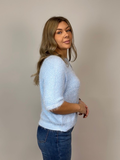 Ljust blå stickad tröja med lite härlig lyster, båthals och 3/4 ärm.