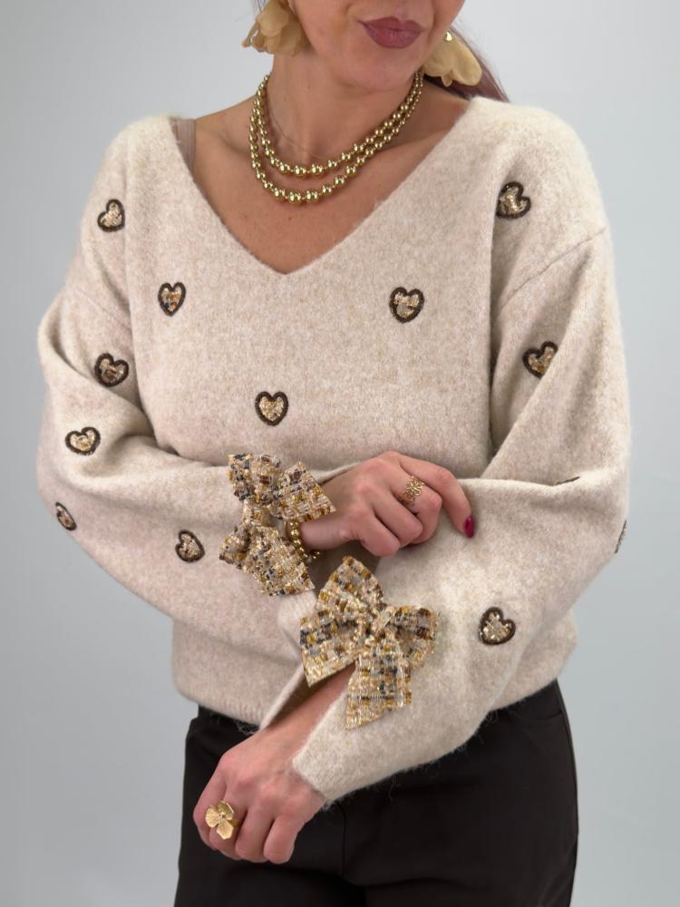 En beige drömmig tröja med påsydda hjärtan och dekorativa rosetter vid ärmsluten - Onesize (stl 34-44)