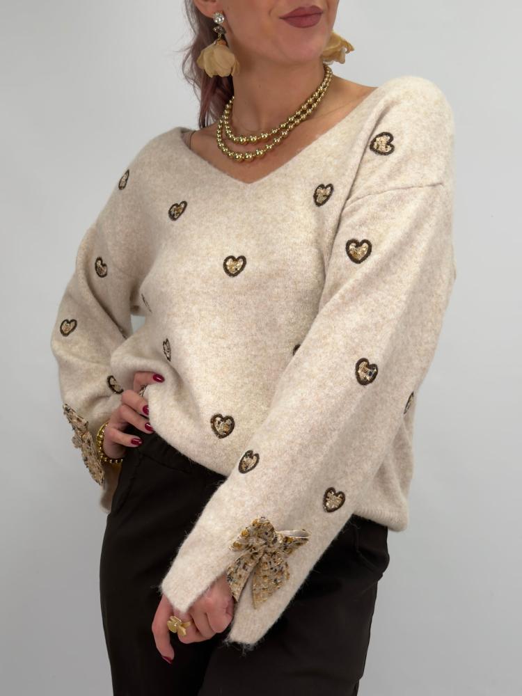 Fin och detaljrik v-ringad stickad tröja. Guldglittriga hjärtan samt rosetter vid sprundet i ärmslutet - gör denna tröja till en riktig eye catcher vare sig den används för vardagslyx - eller på middagsdejten.