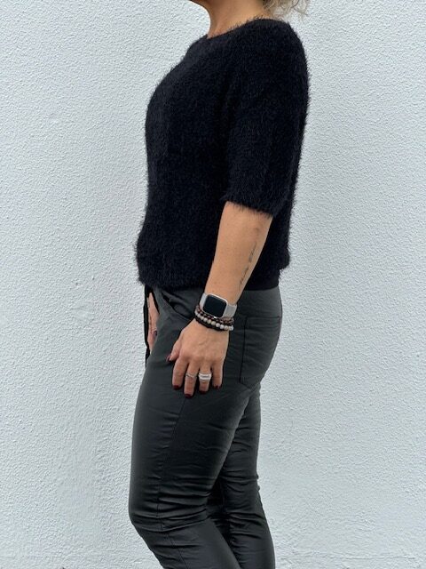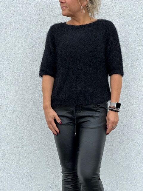Svart stickad tröja med lite härlig lyster, båthals och 3/4 ärm.
