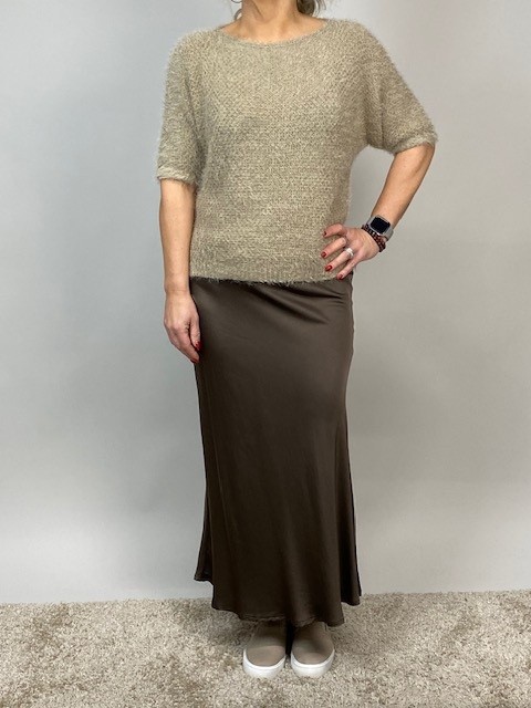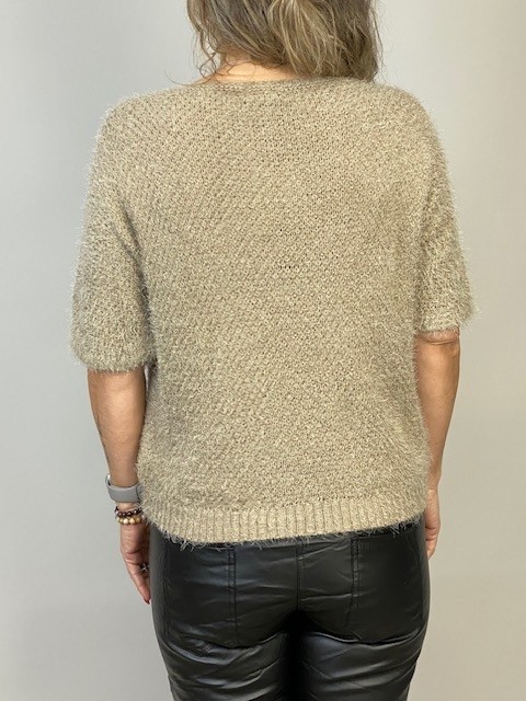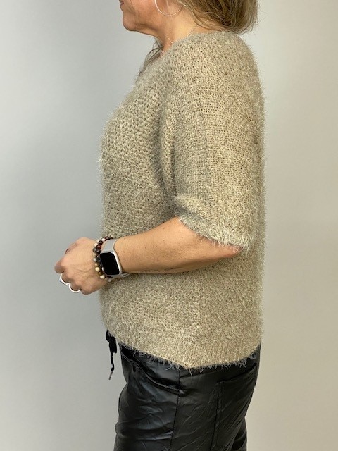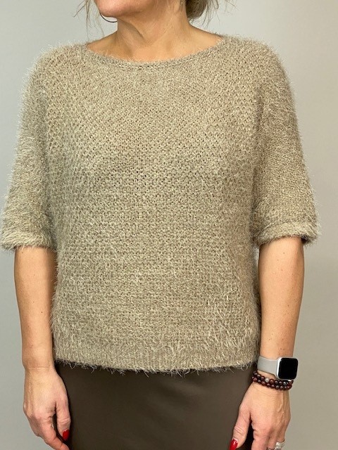 Taupefärgad stickad tröja med lite härlig lyster, båthals och 3/4 ärm.