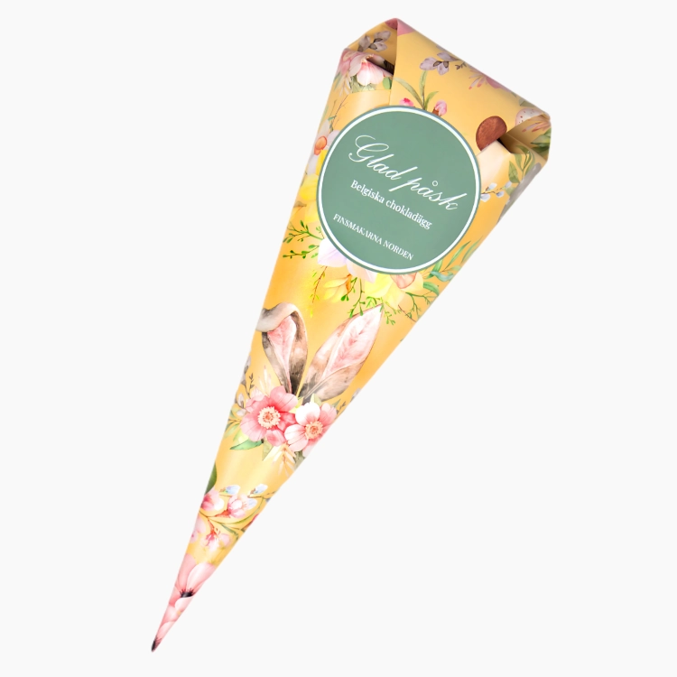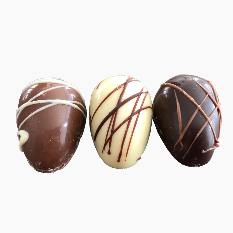 Belgiska handdekorerade ägghalvor av vit, ljus och mörk choklad. Vikt 90g.