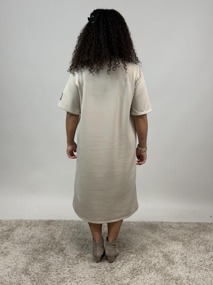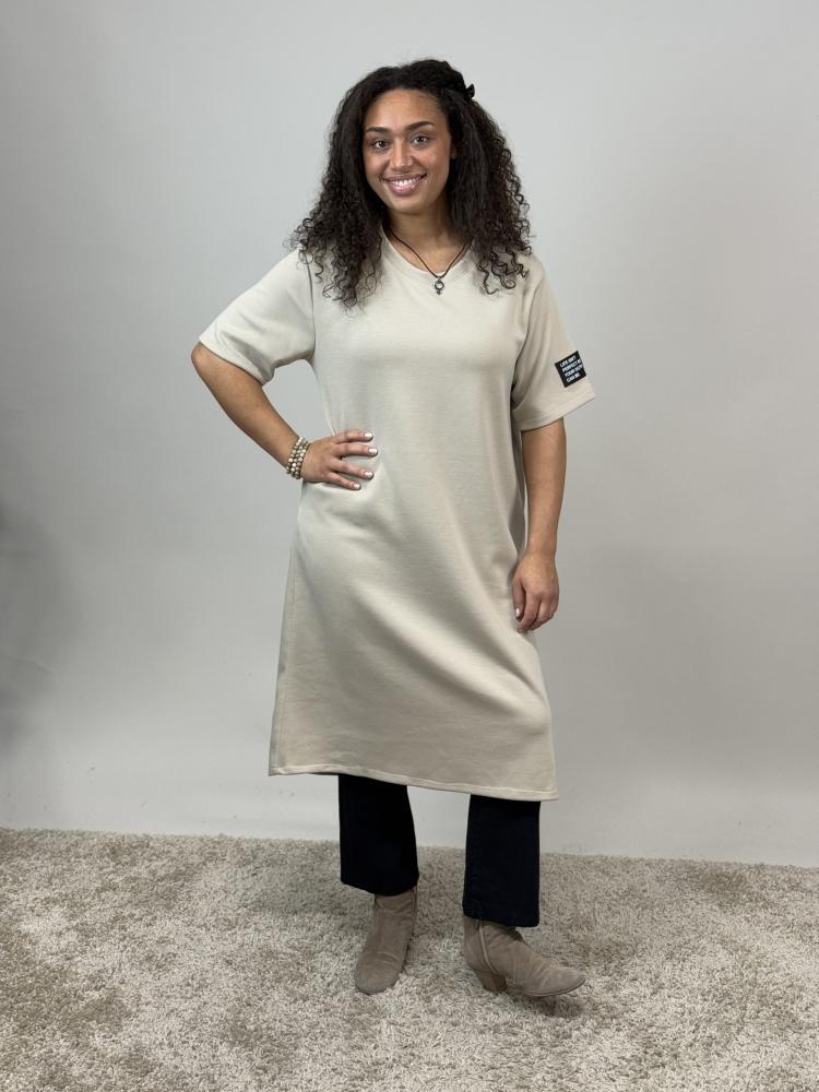 Supermjuk och skön klänning i sweatshirtsmaterial. Rundhalsad i en mjuk och behaglig beige nyans. Fickor i sidan samt ett märke på ärmen, med texten: Life isn´t perfect but your outfit can be.