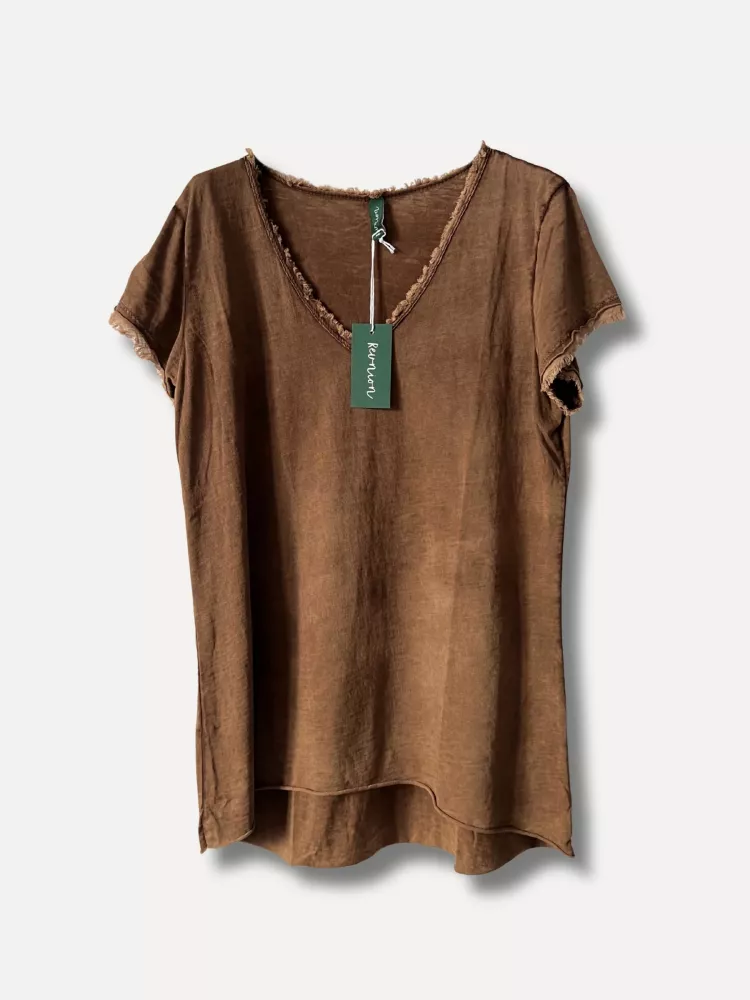 Lollo är t-shirten med det lilla extra – en enkel men stilsäker top med rå fåll nedtill och snyggt fransade kanter i både v-ringning och ärmslut. Den är något kortare fram än bak, vilket ger en ledig silhuett som passar lika bra till kjol som till jeans eller shorts. Den råa kanten nedtill gör det dessutom enkelt att klippa till önskad längd utan att det tappar stilen – perfekt för dig som vill sätta en personlig touch!