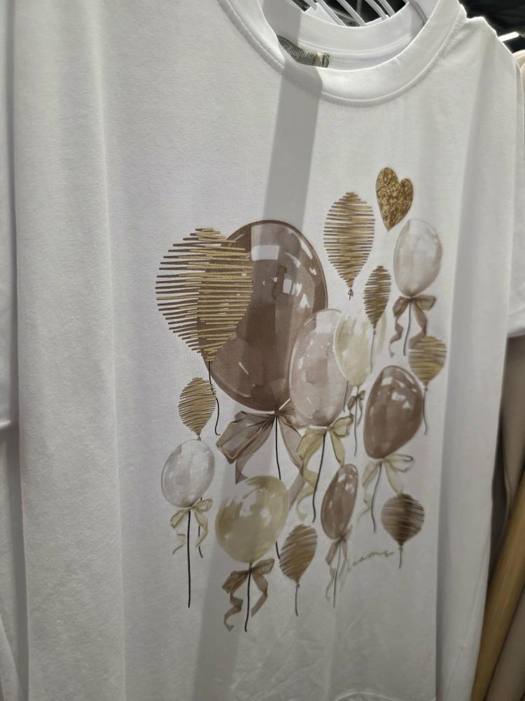 Vit t-shirt i en rymlig modell med lite vidare rund hals och kort ärm. Printet är olika ballonger i bronsfärgade toner samt ett glittrigt guldhjärta.