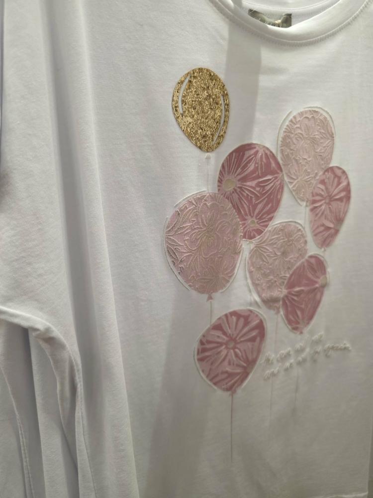 Vit t-shirt i en rymlig modell med lite vidare rund hals och kort ärm. Printet är olika ballonger - med struktur - i rosa toner, samt en glittrig guldfärgad ballong.