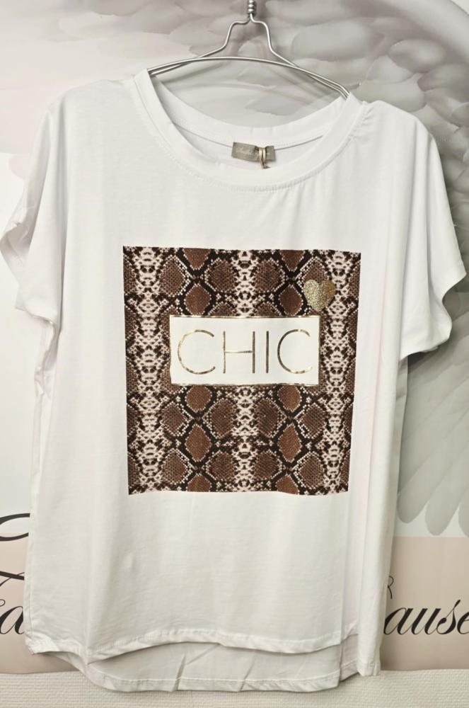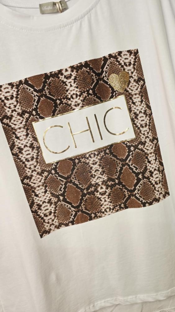 Inze är en trendig och fräsch t-shirt från Soulful Fashion – perfekt för dig som gillar en avslappnad men ändå elegant stil. Den har en rymlig modell med rund hals och kort ärm som gör den lätt att bära till både jeans, kjol och kavaj. Det snygga printet med texten ”CHIC” i guldfärgade bokstäver och snakeinspirerat mönster ger en sofistikerad touch med glimrande detaljer som lyfter hela looken.