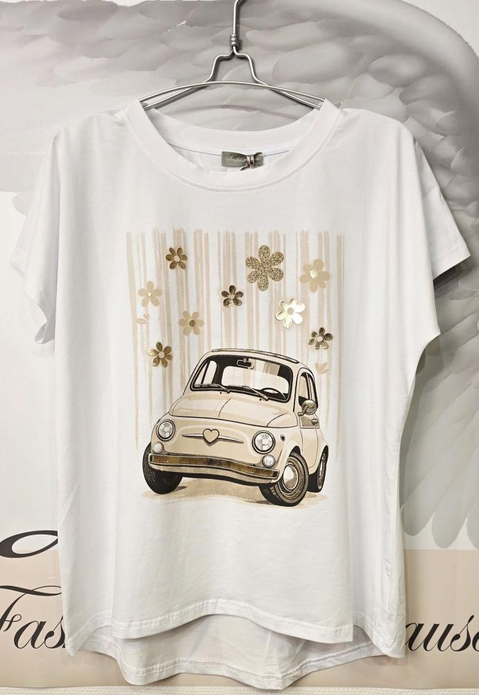 Vit t-shirt i en rymlig modell med lite vidare rund hals och kort ärm. Mönster av en sandfärgad söt liten Fiat, samt blommor i beige och guld.