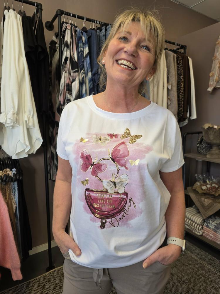 Vit och fräsch tischa i en kvalité som känns lite lyxig - med print av fjärilar - Onesize