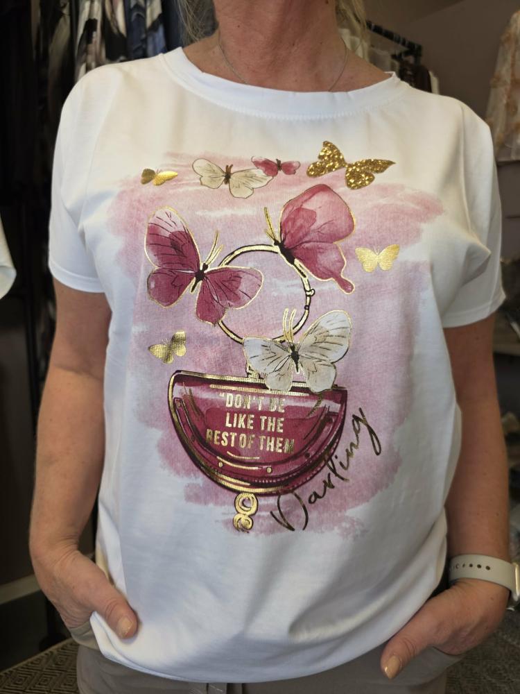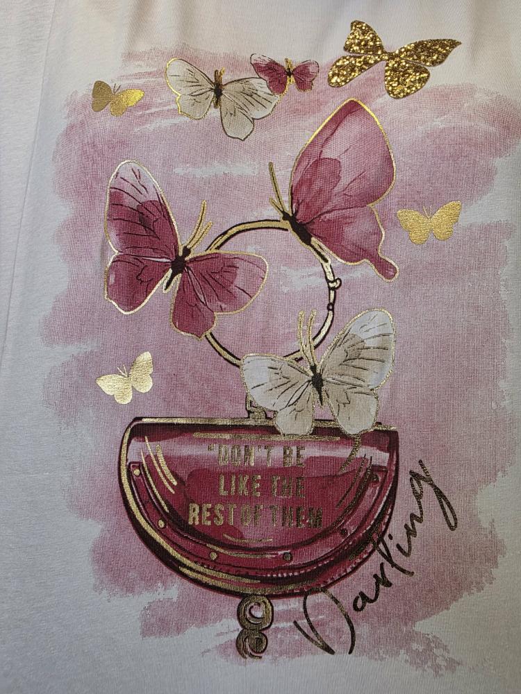 Vit t-shirt i en rymlig modell med lite vidare rund hals och kort ärm. Printet är fjärilar i rosa och vita toner, samt en guldfärgad fjäril. Text: Don´t be like the rest of them, Darling - i guld.