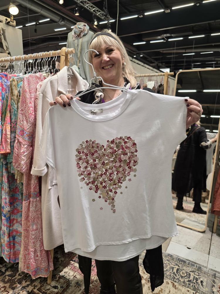 Vit och fräsch tischa i en kvalité som känns lite lyxig - med print av ett hjärta - Onesize