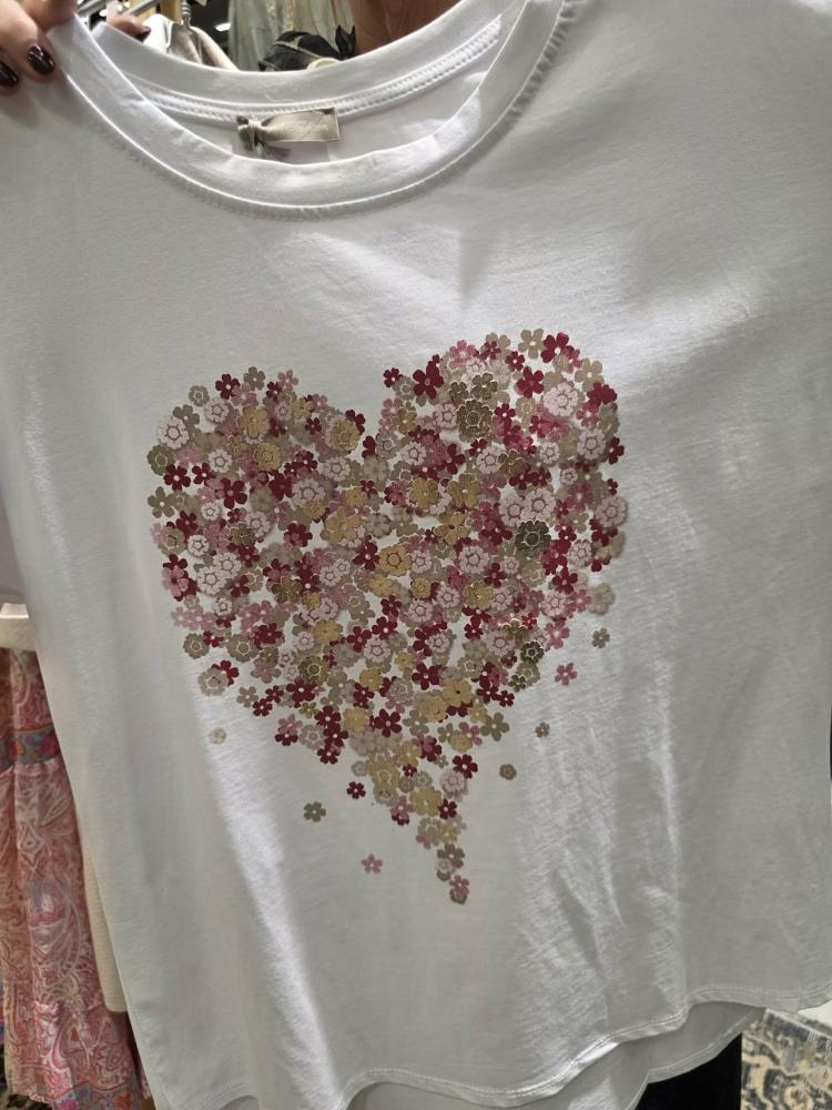 Vit t-shirt i en rymlig modell med lite vidare rund hals och kort ärm. Printet är ett stort hjärta - av små blommor i rosa, rött och guld.