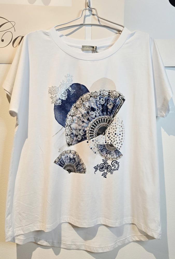 Vit och fräsch tischa i en kvalité som känns lite lyxig - med print av en solfjäder i blå toner - Onesize