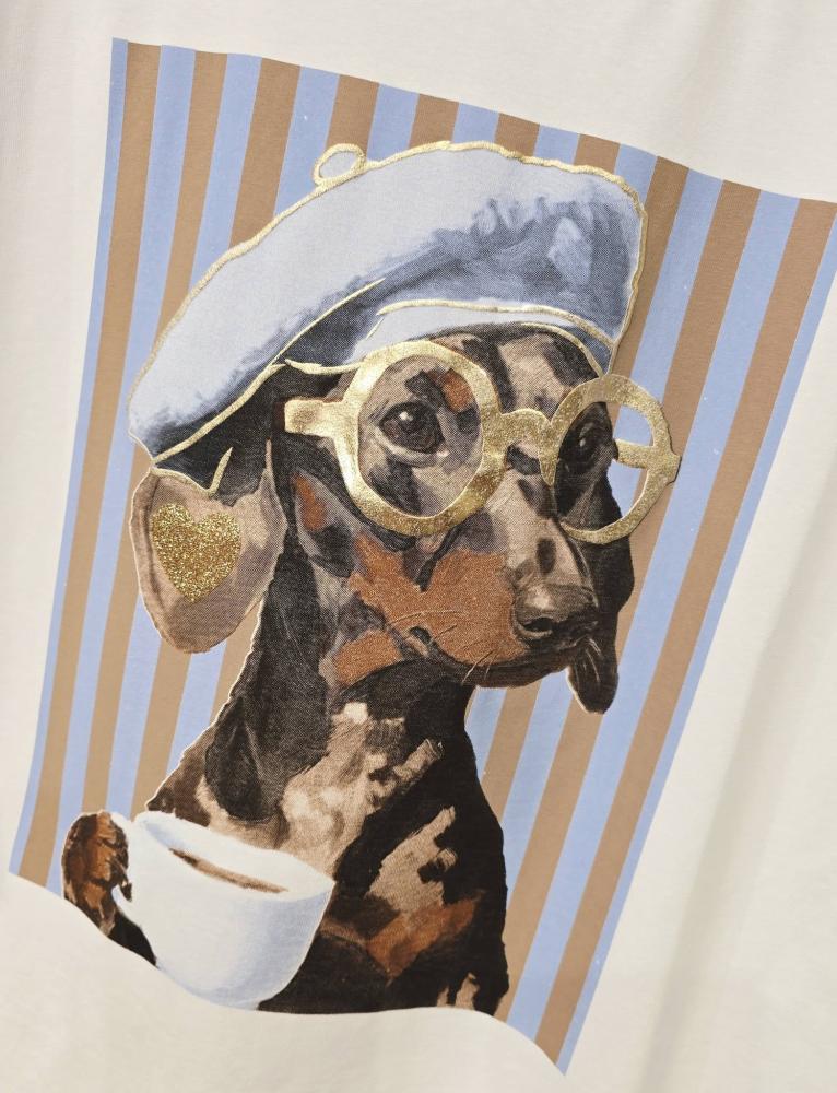 Vit t-shirt i en rymlig modell med lite vidare rund hals och kort ärm. Mönster av en mörk tax i basker med polkagris randig bakgrund i ljusblå och sand. Taxen har guldfärgade solglasögon och håller i en mugg.