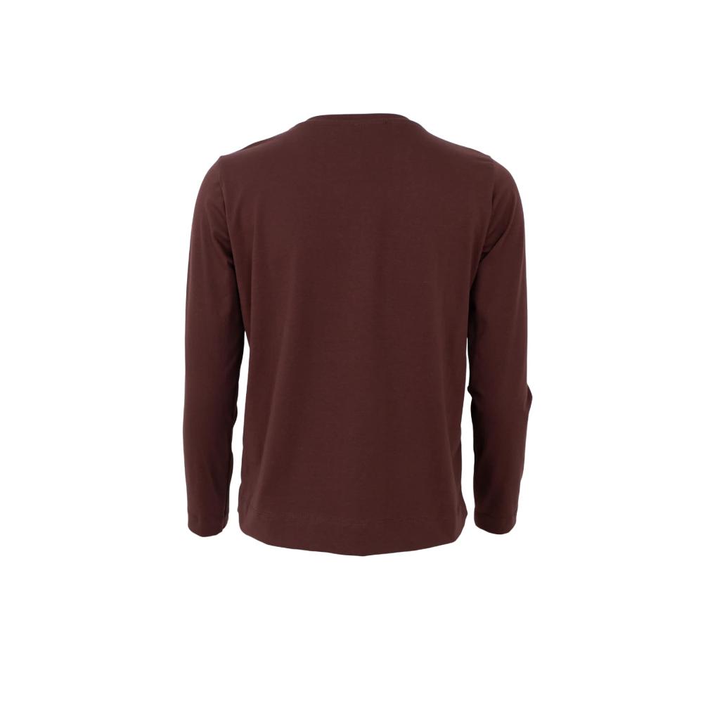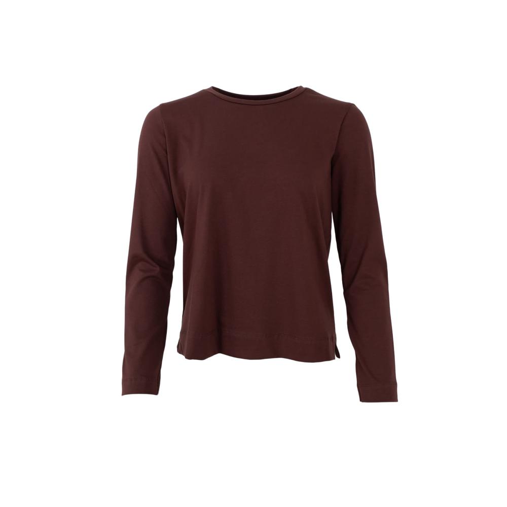 Långärmad coffee färgad topp med rund hals. Bred "kant" nertill och kort slits i sidorna.