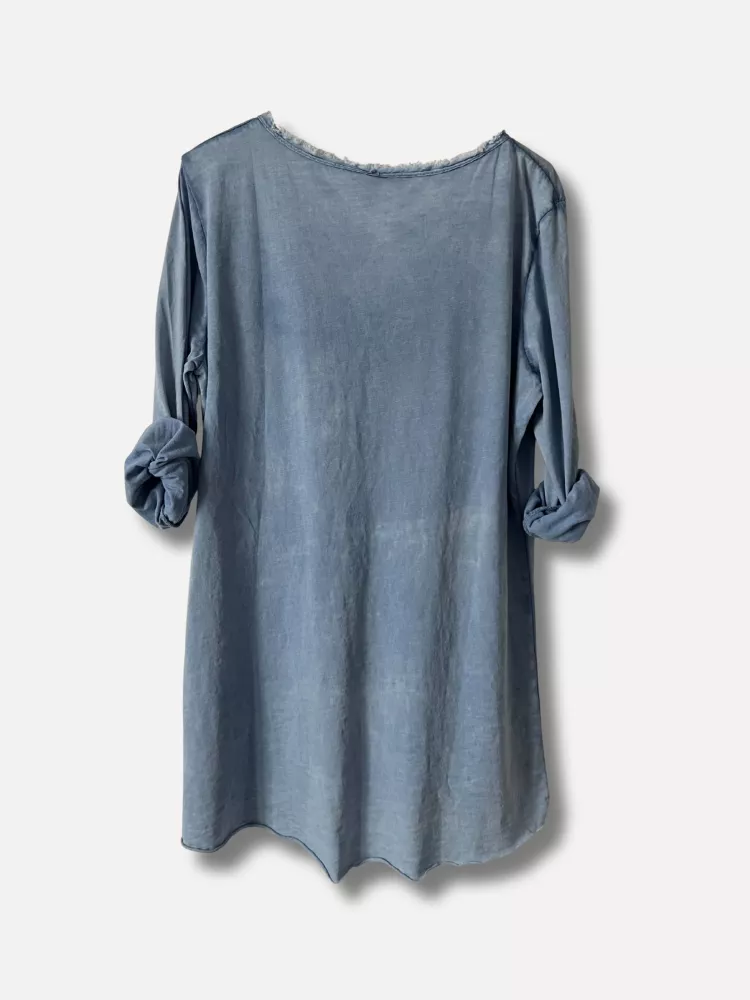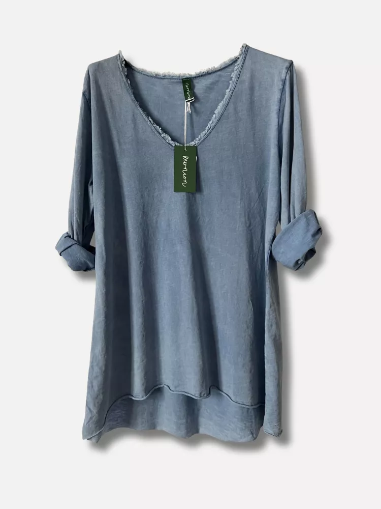 En denim blå lite kaxigare långärmad tischa med fransig kant i v-hals - Onesize