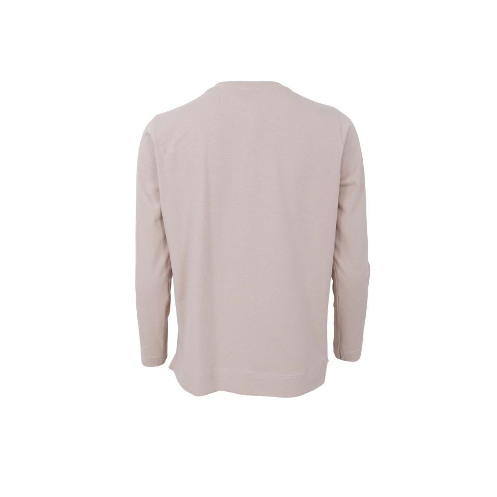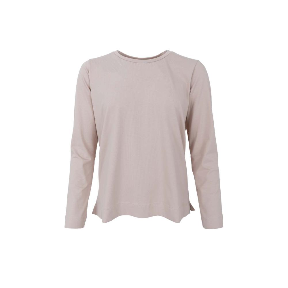 Långärmad sandfärgad topp med rund hals. Bred "kant" nertill och kort slits i sidorna.