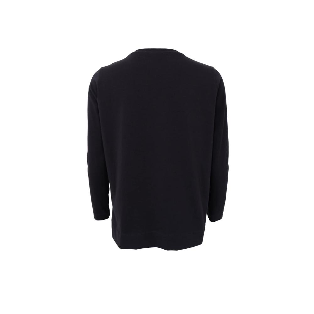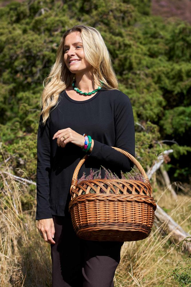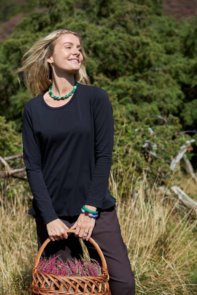 May är en svart rundhalsad topp med den lilla extra touchen. Modellen är långärmad med bred kant nertill och små slitsar i sidorna som ger en snygg siluett. Den är lite kortare i modellen, vilket gör att du slipper stoppa ner den i byxor eller kjol – perfekt när du vill ha en mer avslappnad men ändå stilren look.