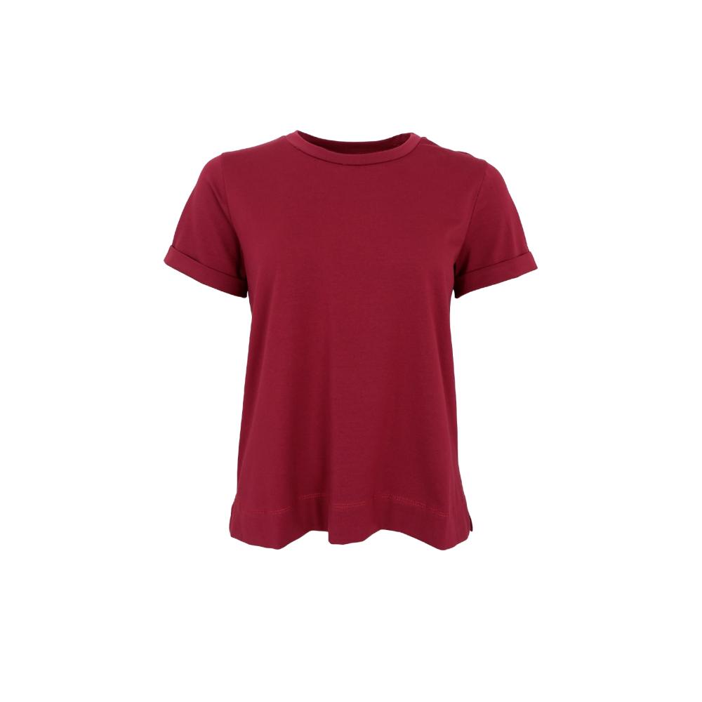 May är en rundhalsad t-shirt med den lilla extra touchen. Modellen är kortärmad med uppvikt ärm, bred kant nertill och små slitsar i sidorna som ger en snygg siluett. Den är lite kortare i modellen, vilket gör att du slipper stoppa ner den i byxor eller kjol – perfekt när du vill ha en mer avslappnad men ändå stilren look.