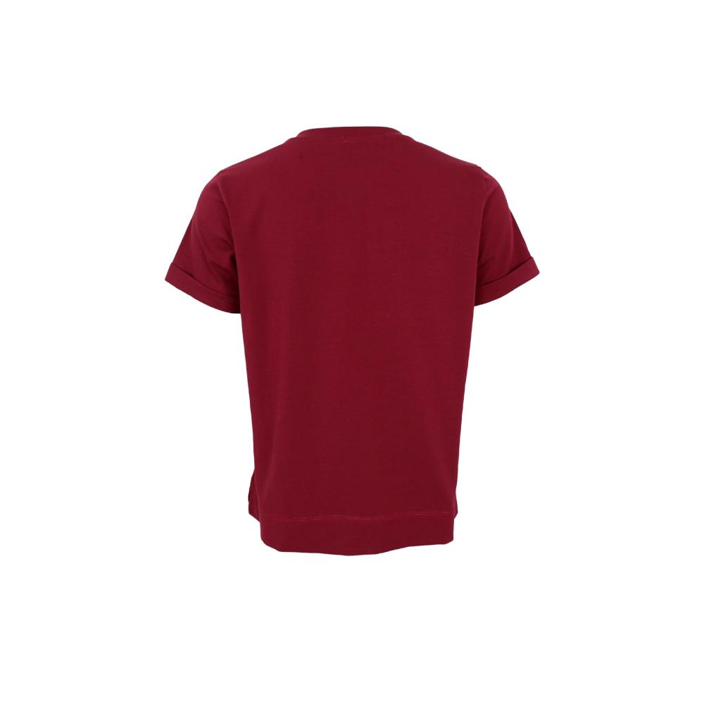 Kortärmad topp, rundhalsad och uppvikt ärm. Bred "kant" nertill och kort slits i sidorna.