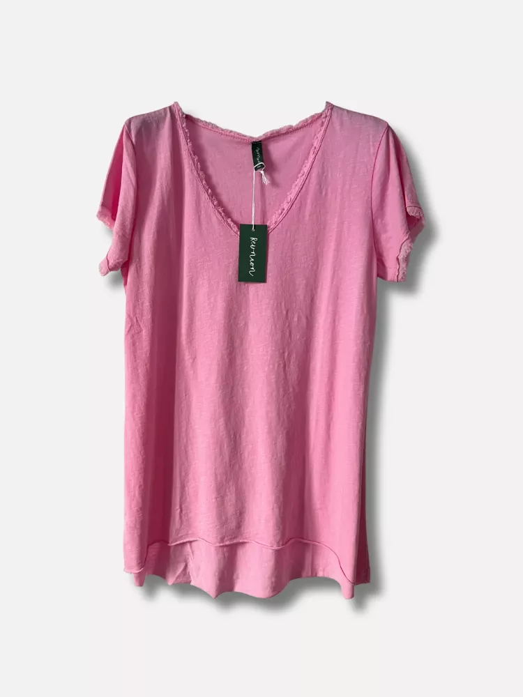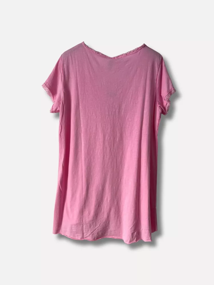 En bubbelgumsrosa lite kaxigare t-shirt med fransig kant i v-hals och ärmslut - Onesize