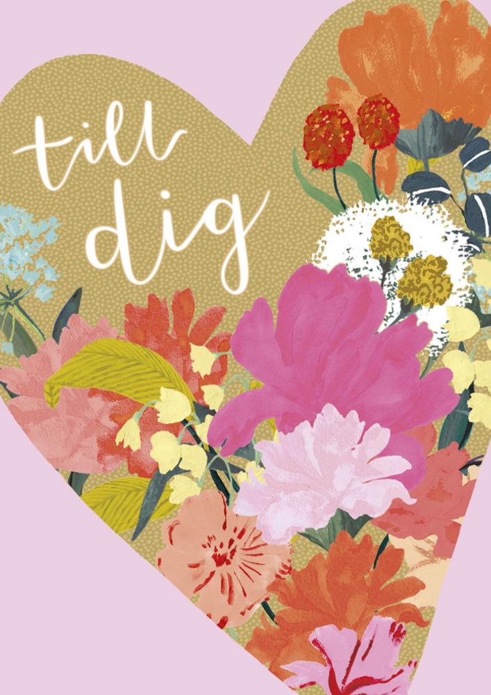 Dubbelt bubbelgumsrosa kort med print av färgglada blommor i ett hjärta av guld, samt texten: till dig.