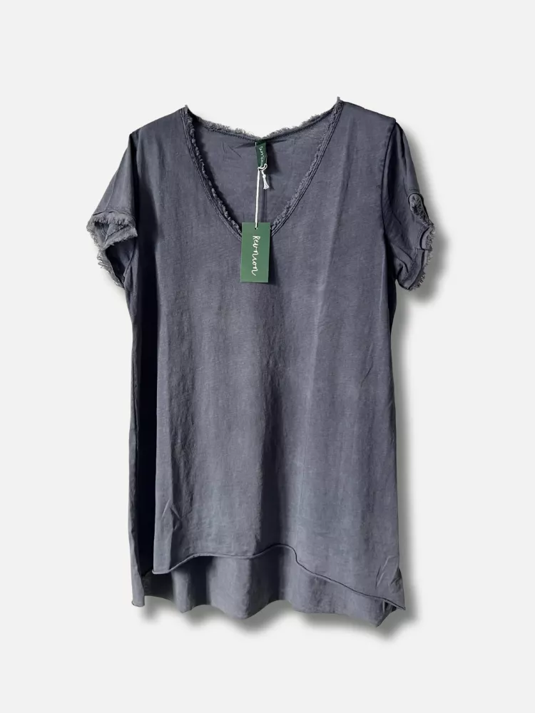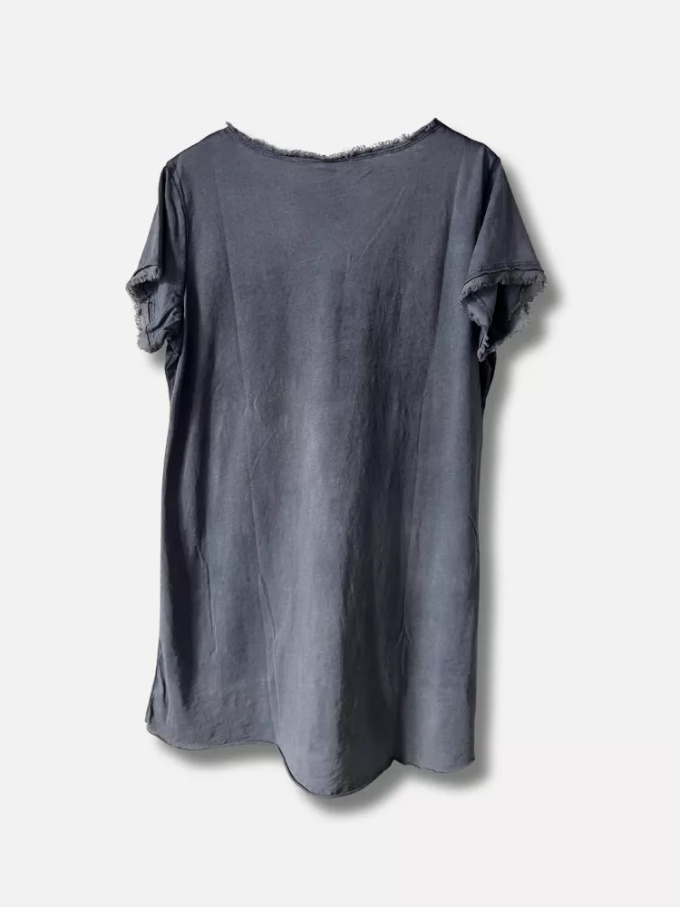 Lollo är t-shirten med det lilla extra – en enkel men stilsäker top med rå fåll nedtill och snyggt fransade kanter i både v-ringning och ärmslut. Den är något kortare fram än bak, vilket ger en ledig silhuett som passar lika bra till kjol som till jeans eller shorts. Den råa kanten nedtill gör det dessutom enkelt att klippa till önskad längd utan att det tappar stilen – perfekt för dig som vill sätta en personlig touch!